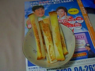 昼飯にサンドイッチ作ったからその耳を炒めた。マーガリンで。